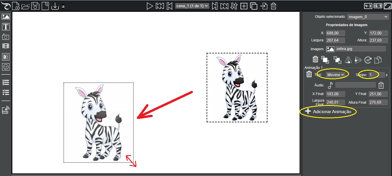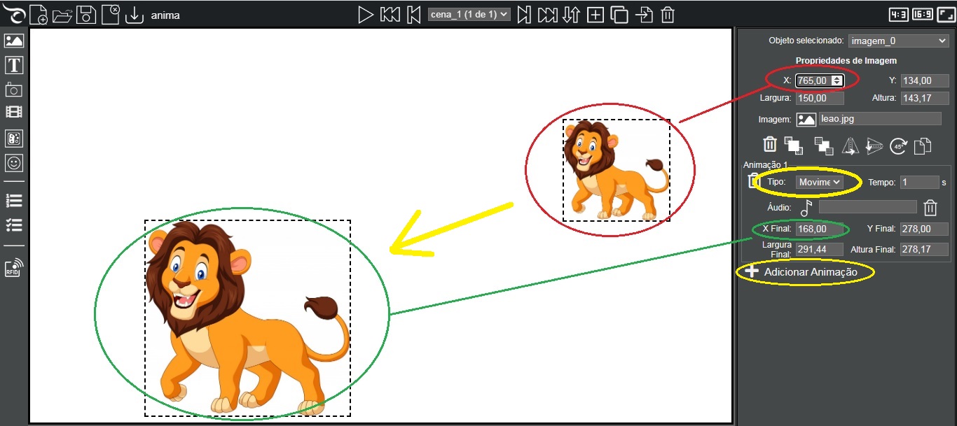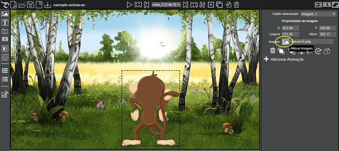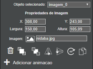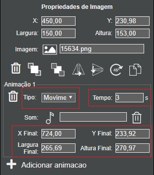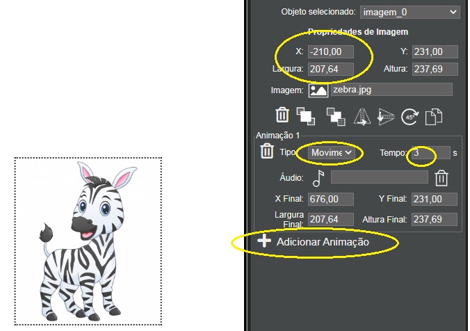 - Tempo: 3 segundos e alterar a posição inicial da imagem X: -210. Observe que a imagem do exemplo tem uma largura de 207 pixels, então a posição inicial X deve ser 207 pixels ou mais à esquerda da borda da tela, por isso usamos o valor (negativo) 210, ou seja, a imagem estará a -210 pixels da borda esquerda quando a cena for exibida, estando portanto, fora da área visível da cena. Com a animação, ela vai se movendo até a posição final da animação, aparecendo na cena.