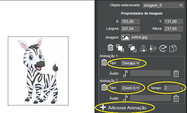 Para isso, basta Adicionar Animação Tipo: Desaparecer, para que a imagem não apareça quando a cena for exibida. Adicionar Animação Tipo: Zoom In - Tempo: 2 segundos.