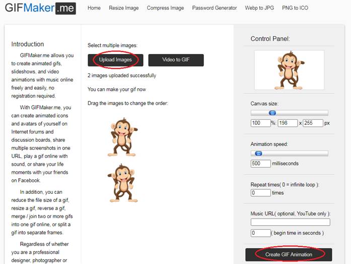 é possível criar um GIF animado a partir do envio de 2 ou mais imagens.