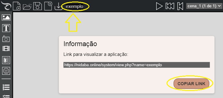 Clicando sobre o nome da aplicação aparece o link para visualização da aplicação no emulador, que pode ser disponibilizado para outras pessoas que não tem acesso ao Eduba Editor.